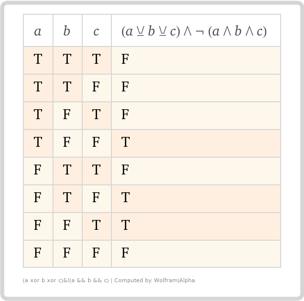 Truth Table for "oneOf" - (a xor b xor c) & ! (a && b && c)